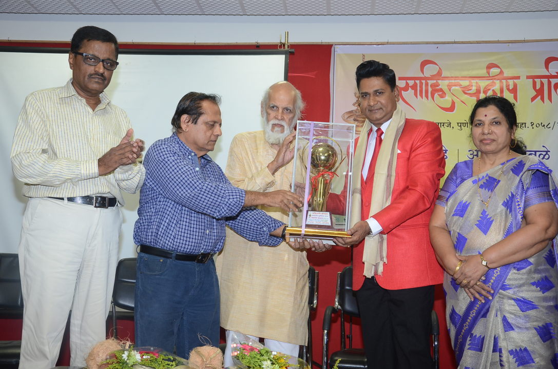 (From left to right) Poet Shri. Anil Kamble, Composer Shri Surendra Akolkar, Cartoonist Shri Mangesh Tendulkar, Chandrashekhar Mahamuni and Poet Sau. Jyotsna Chandgude.